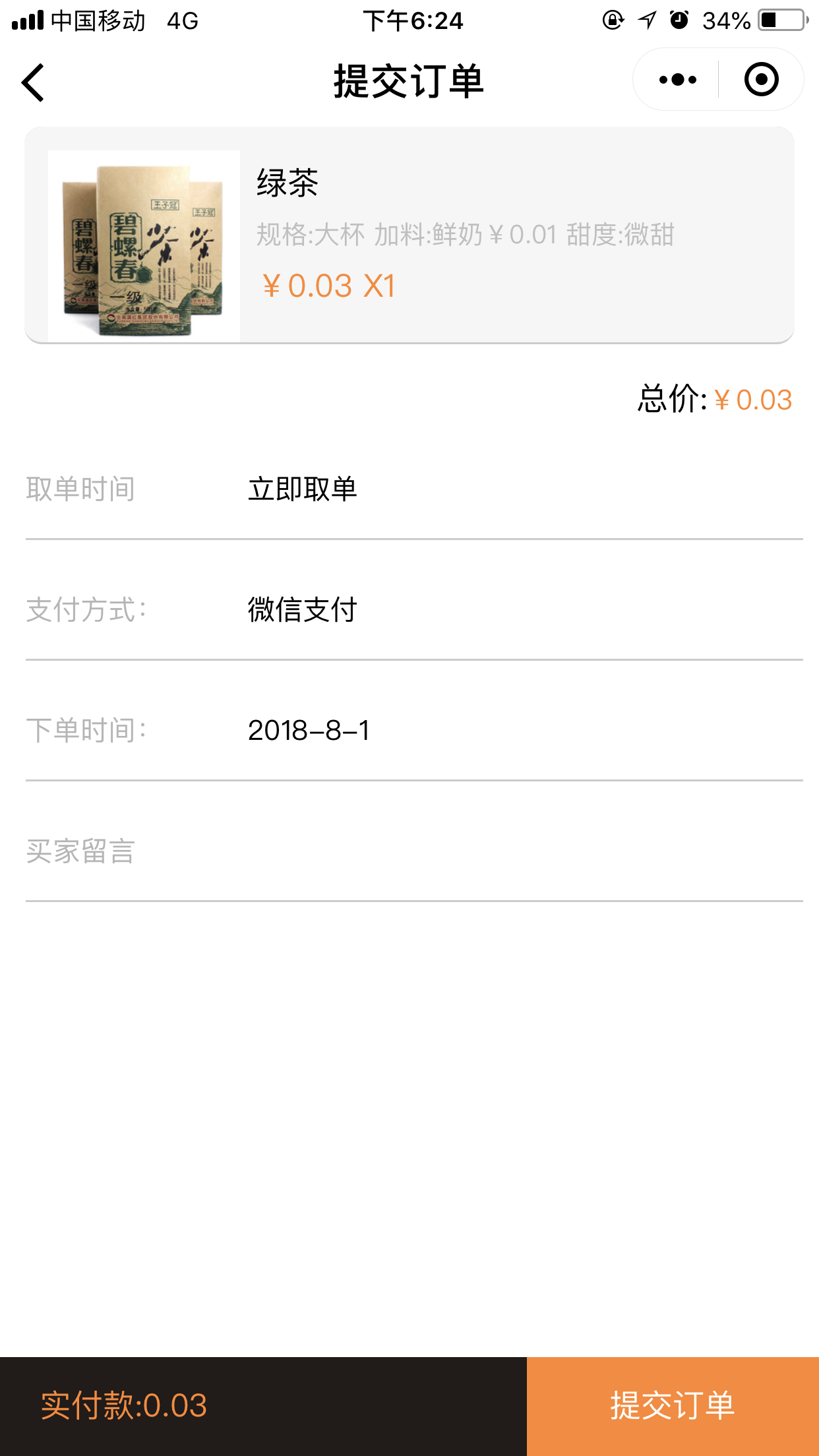 4.在前台,用户点击“开始点单”可以根据位置匹配到最近的店面,并且可以选择取餐的方式“立即取餐”或“稍晚取餐”,进入点单列表页我们添加菜品时,可以选择我们在后台添加的“配料”、“口味”、以及“规格”等,选择完毕之后,点击“去结算”跳转到提交订单页面,取单时间根据用户的选择会显示为“立即取单”或者为“取单的时间点”,提交订单后,会跳转到“订单详情”页面,当商家在后台点击“接单”接单后,会有“取餐码”显示出来,如图所示: