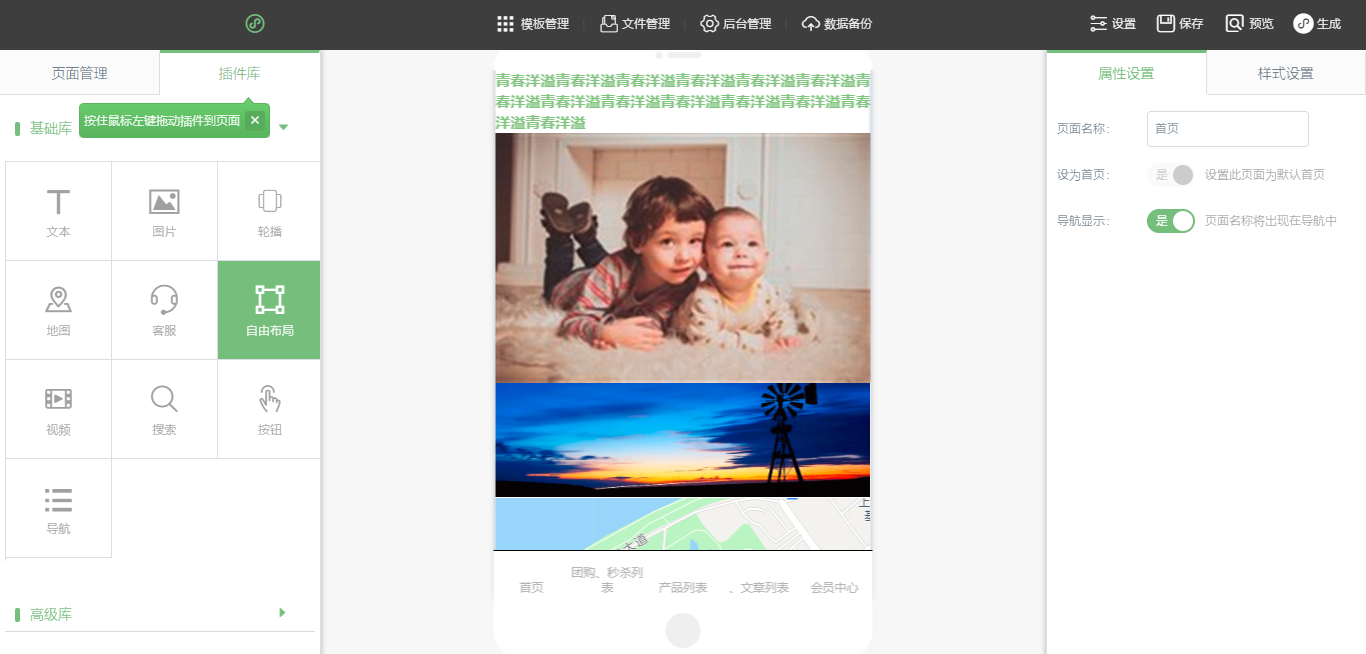 4.在小程序编辑器中,拖入插件后,点击生成,选择“百度小程序”下载代码(注:在编辑器中布局页面时注意“地图”、“视频”、“web页面”为原生组件因此会对其他插件有覆盖的情况!),在百度小程序开发者工具中选择“打开”文件夹即可,如图所示: